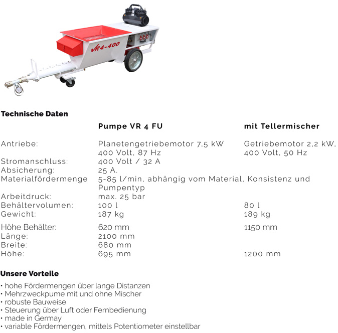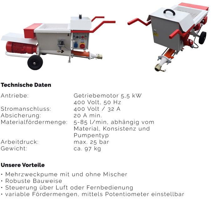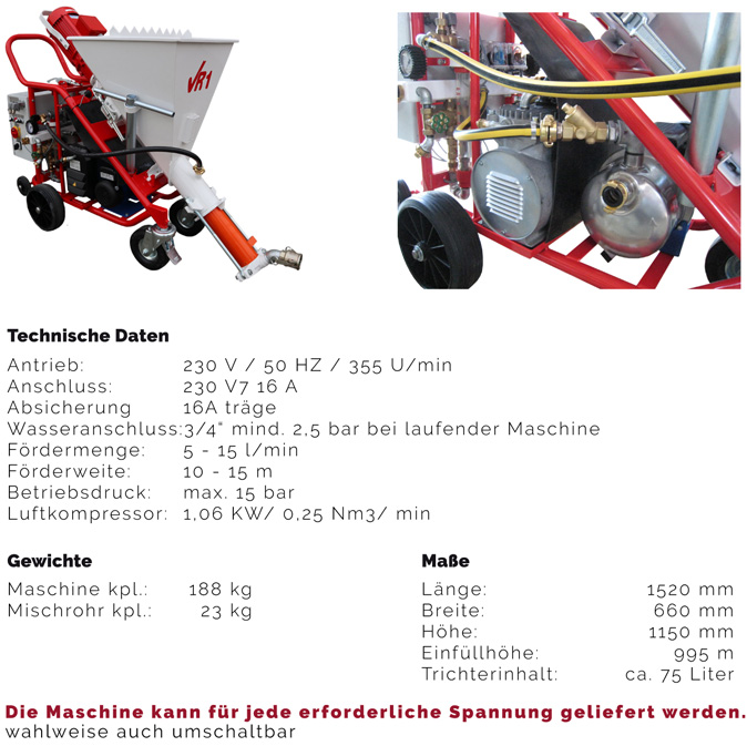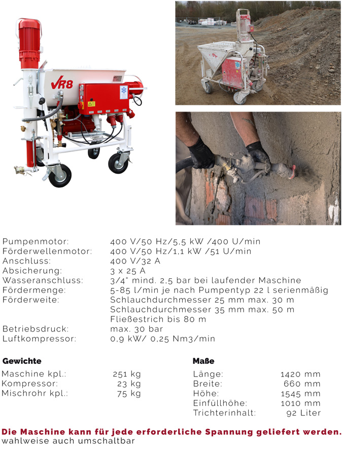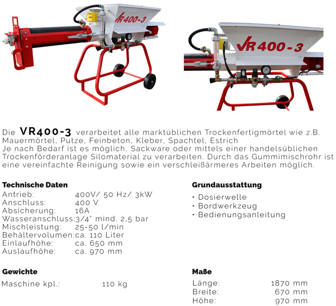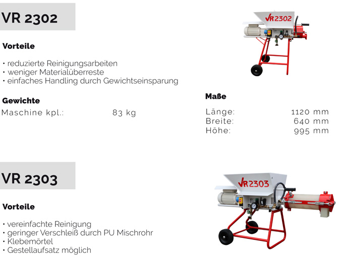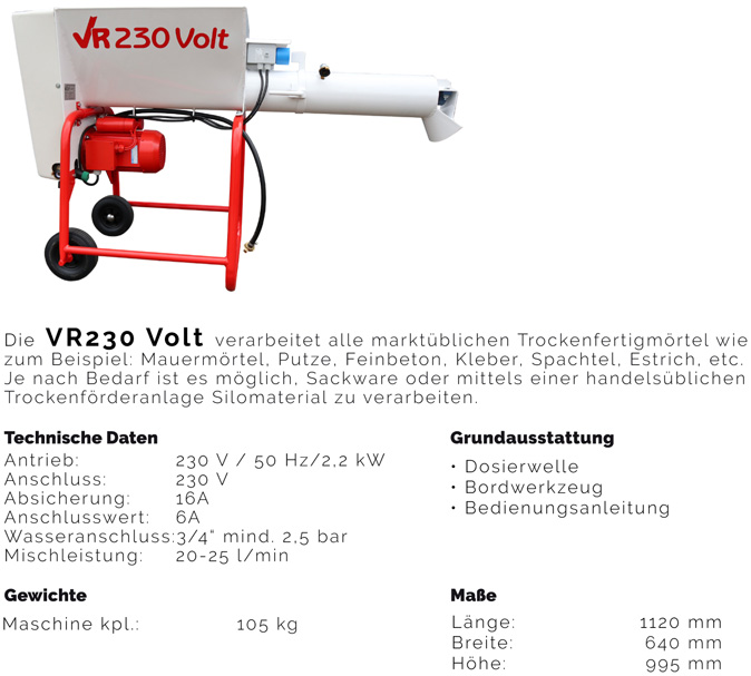 Der Durchlaufmischer VR 230 Volt verarbeitet Trockenfertigmörtel wie Mauermörtel, Feinbeton, Kleber, Spachtel, Estrich.