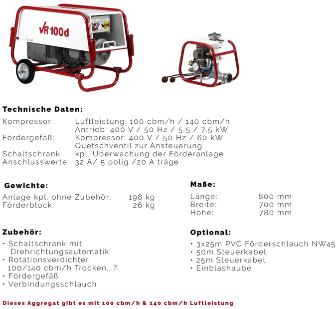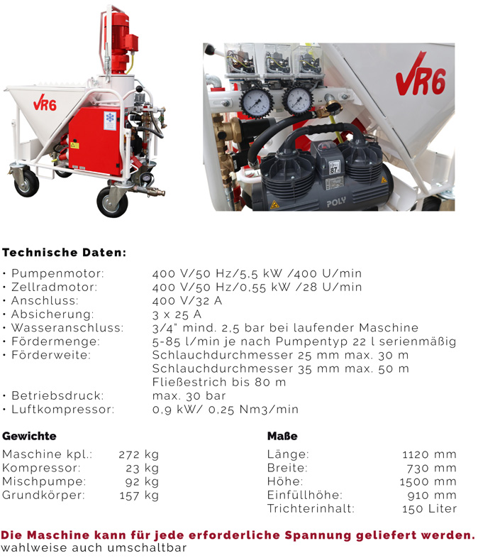 Die Verputzmaschine VR6 ist für alle maschinengängigen Werktrockenmörtel geeignet. Je nach Bedarf ist es möglich, Sackware mittels einer handelsüblichen Förderanlage Silomaterial zu verarbeiten.